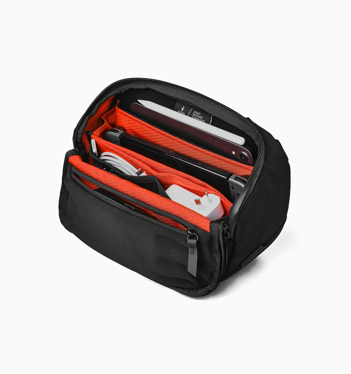 A revolutionary all-in-one solution designed to streamline your daily tech essentials and keep you organised on the go. It’s a triple threat: tech pouch, desk caddy, and sling bag all in one.