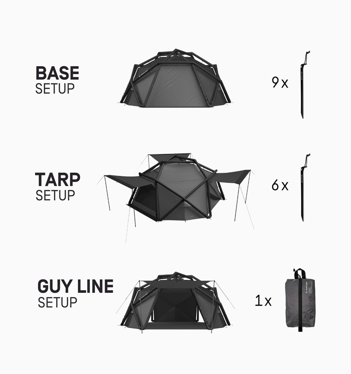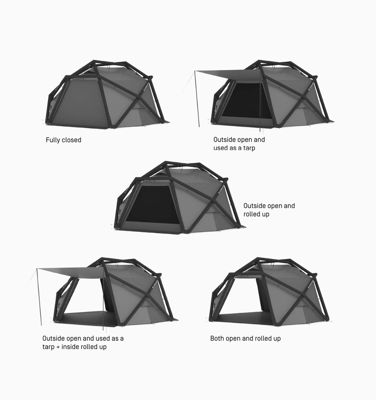 • Flexibility: The frame, flysheet, inner tent and the groundsheet can be pitched in a single step (inflation). The tent is designed so the single elements can be disassembled and the flysheet, the inner tent and the groundsheet can also be used independently.