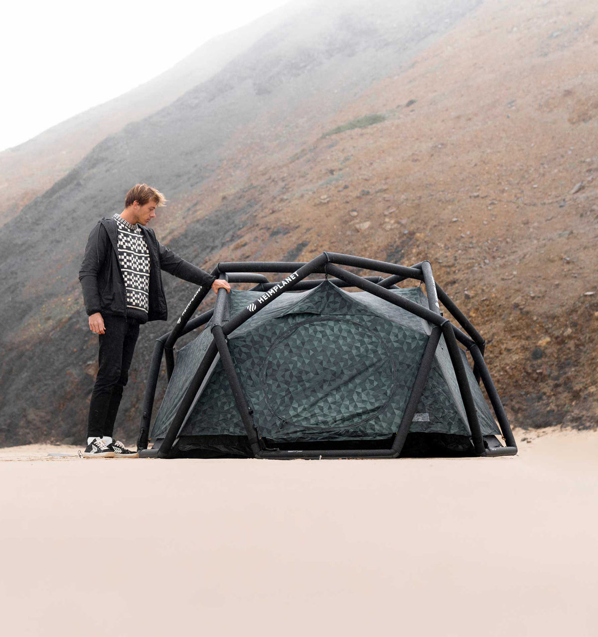 The Cave was Heimplanet's first inflatable tent, still iconic and perfect for 2-3 people. All you need is a pump to pitch your tent in less than a minute. Thanks to its geodesic dome construction with ten crossing points THE CAVE is extremely stable and thanks to the high-quality materials it is also weatherproof as well as durable. The inflatable Diamond Grid (IDG) not only guarantees stability, but also ensures an intuitive and easy set-up of THE CAVE so that you can get the most out of your trip. It supports the waterproof ripstop polyester Flysheet and ripstop nylon inner tent with multiple storage pockets - perfect for storing smaller items.